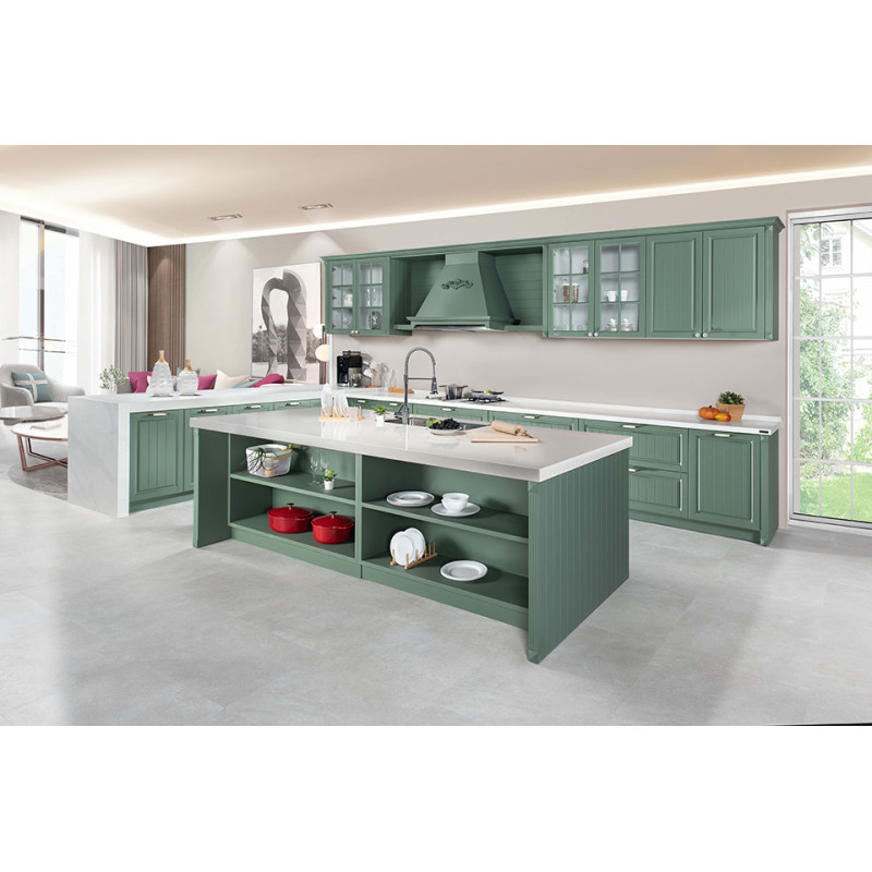 門板以陶瓷烤漆處理,加以仿實木造型雕刻門型,搭配羅馬柱、多層次線板、復古把手,融合古典與現代美感,表現出新鄉村風風格,讓廚房化身為藝術作品;此產品風格另提供HCG系統櫃搭配組合,創造獨一無二的生活空間。